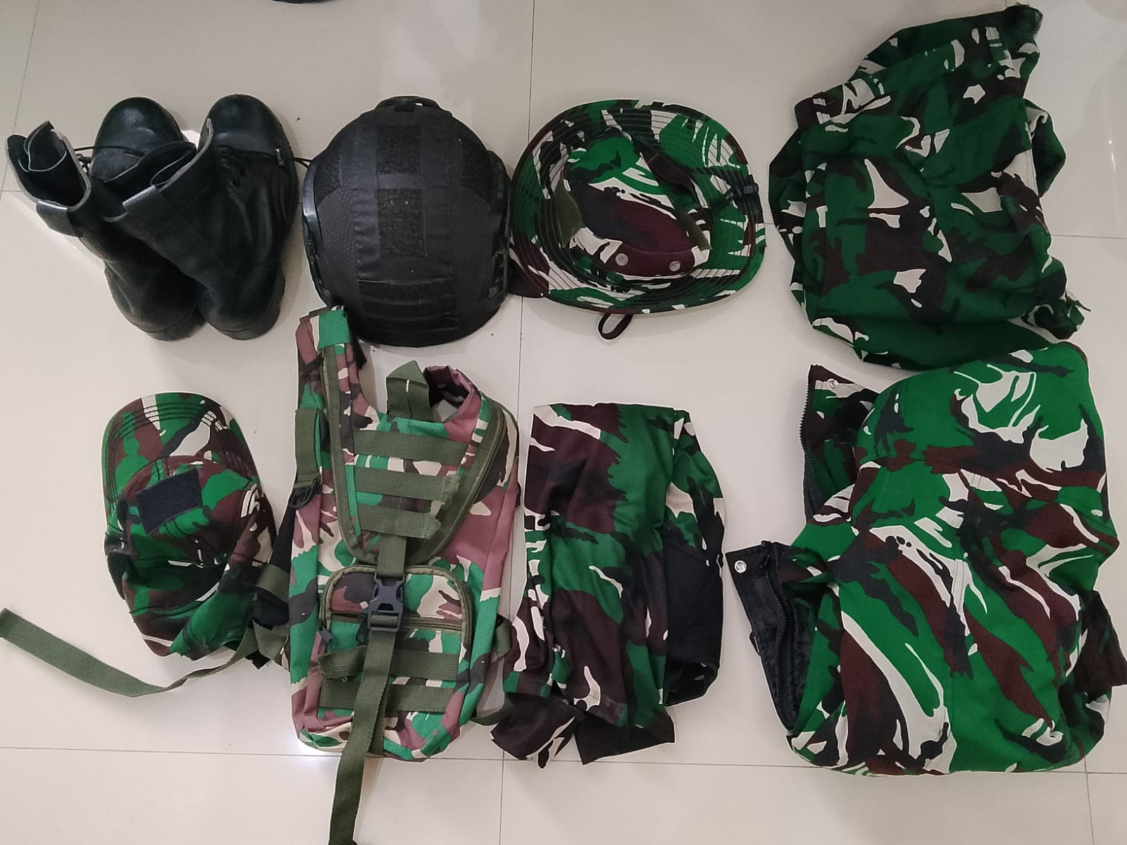 Dalam pengamanan tersebut, petugas turut menyita sejumlah barang bukti, antara lain pakaian loreng TNI lengkap, helm taktis, tas loreng, sepatu PDL, enam unit handphone, puluhan KTA TNI palsu dan KTP palsu, satu unit komputer monitor, serta satu unit printer yang diduga digunakan untuk mencetak identitas palsu.